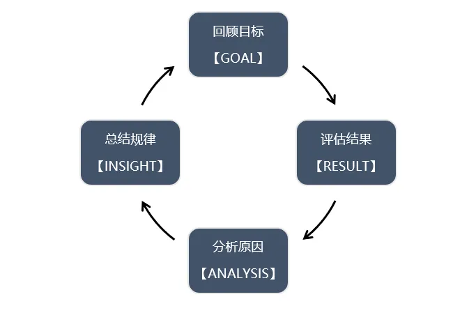 GRAI是复盘最常见的方法之一,在直播复盘中也同样适用,大致可以分为四个步骤:目标回顾——评估结果——分析原因——总结经验。